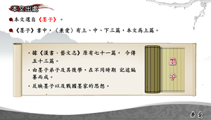 包含:1.本文出處:選自《墨子》。《墨子》書中,〈兼愛〉有上、中、下三篇,本文為上篇。2.文體:論辯性質的語錄體(由語錄體向論辯體的過渡階段)。3.寫作背景:春秋戰國時代,王權衰落,諸侯爭霸,各國開放政權以延攬人才,社會發生劇變。