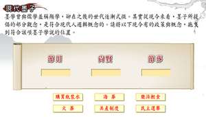 將現今政策與概念,拖曳到符合該項墨子學說的位置。藉以應用墨子學說的概念。