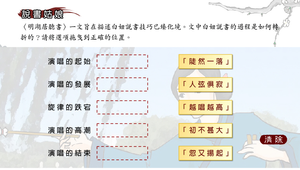 根據明湖居聽書一文描寫白妞說書的過程,將各階段代表的描述,依照說書過程拖曳到正確的位置。