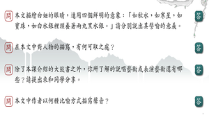 1.本文描繪白妞的眼睛,連用四個鮮明的意象:「如秋水,如寒星,如寶珠,如白水銀裡頭養著兩丸黑水銀。」請分別說出其譬喻的意義。2. 在本文中對人物的描寫,有何可取之處?3.除了本課介紹的大鼓書之外,你所了解的說唱藝術或表演藝術還有哪些?請提出來和同學分享。4.本文中作者以何種比喻方式描寫聲音?