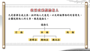 針對議論文的引論、本論、結論三部分,以及本論中可運用到的演繹、歸納、類比法作簡單介紹。