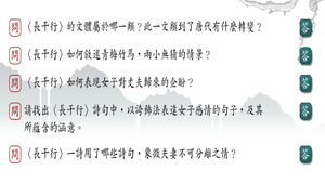 1.長干行的文體屬於哪一類?此一文類到了唐代有什麼轉變?2.長干行如何敘述青梅竹馬,兩小無猜的情景?3.長干行如何表現女子對丈夫歸來的企盼?4.請找出長干行詩句中,以誇飾法表達女子感情的句子,及其所蘊含的涵意。5.長干行一詩用了哪些詩句,象徵夫妻不可分離之情?