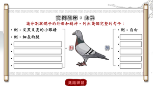 瞭解楊牧描寫老鷹形、神兩方面的手法後,以鴿子為例自行演練,針對鴿子外形和精神,描寫出完整的句子。