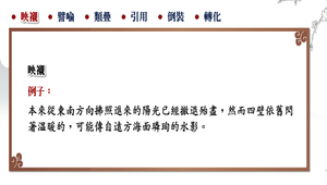 解析本課所使用的修辭法;包含:映襯、譬喻、類疊、引用、倒裝、轉化。