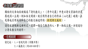 楊牧的文章向來被稱為「詩化散文」,亭午之鷹中更以詩文穿插的方式展現同一主題。請你試著模擬這種形式,選擇一個自己熟悉的人、事、物為主題,分別進行小詩及散文的創作。完成一首現代詩(字數不限),一篇散文(約400-800字)。