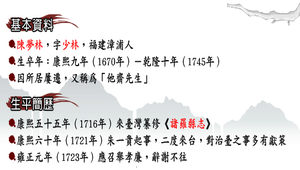 包含:1.生平傳略:陳夢林,字少林,福建漳浦人,因所居屢遷,又稱為「他齋先生」 。2.軼聞掌故:1.身世乖舛。2.淡泊名利 。