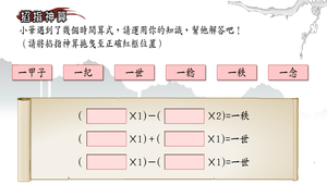 將正確的時間名詞拖曳至空格當中,以完成時間算式。藉此讓學習者瞭解各個時間名詞所代表的時間長度為何。