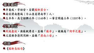 包含:1.生平傳略:辛棄疾,字幼安,自號稼軒居士。。2.軼聞掌故:懲奸鋤惡,擒殺張安國。