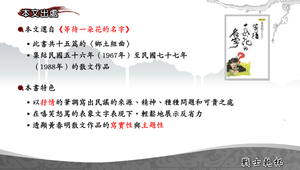 包含:1.本文出處:選自《等待一朵花的名字》。2.文體:為現代散文、鄉土文學 、報導文學。3.寫作背景:約1967年至1988年間。