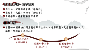 包含:1.生平傳略:生於宜蘭縣羅東鎮「浮崙仔」。2.軼聞掌故:1.巴士海峽」沒師範學校。2.得獎理由。3.溫暖的貨車司機 。