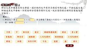 將正確選項以拖曳方式,將關於柳宗元生平描述的空缺填補完成。