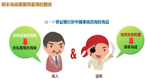 16、17世紀橫行於中國東南沿海的海盜是具備商人與盜賊的雙重身份,在政府海禁政策較寬鬆時,他們是從事走私貿易的海商,在海禁政策實施較嚴時,他們則落草為寇。此時的海商集團以十六世紀的林道乾、林鳳及十七世紀的李旦、顏思齊、鄭芝龍勢力較大。