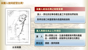 荷蘭人經營臺灣的方式,把臺灣當作是一個殖民地及港口。荷人利用漢人,原住民從事各種生產工作並對他們收稅,荷人另一稅收,是對停泊港口來臺貿易的各國商船抽稅;漢人必須開墾土地、生產各種貿易所需的農產品,原住民則捕鹿、提供勞務,而漢人還需要承擔管理、經營原住民番社的責任。荷人統治的手段,基本上是分層統治,在番社中有「頭人」、開墾的漢人中也有「頭人」,這些「頭人」都由官府定時監控。