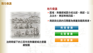 地方會議是荷蘭人有效統治臺灣的手段。熱蘭遮城區分成北部、南部,以及之外的淡水、東部卑南四區。其中,南、北兩路的召開最為慎重與最具規律。南路會議地點在赤崁的公司大庭園;淡水區集會地點在淡水紅毛城附近。