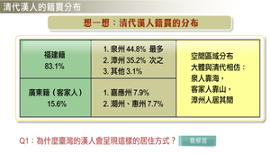 彙整清代臺灣漢人籍貫的分布情形,提問臺灣漢人為何呈現這樣的居住方式。施添福認為清代在臺漢人的祖籍分布和原鄉生活方式有關;尹章義則認為這是盛行分類械鬥的結果。