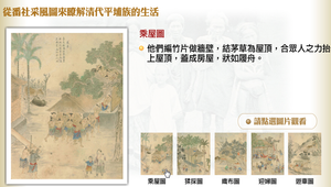 番社采風圖包含:乘屋圖、猱採圖、織布圖、迎婦圖、遊車圖。他們編竹片做墻壁,結茅草為屋頂,合眾人之力抬上屋頂,蓋成房屋,狀如履舟。平埔族腰佩短鐵刀,是他們日常不離身的工具。工作是男女分工:女生種田, 男生採集打獵。