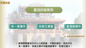 清領時期臺灣的大大小小的民變,不斷的發生,而其中以朱一貴事件、林爽文事件和戴潮春事件,牽連最廣、影響也最大。