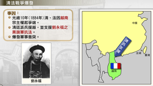 光緒10年(1884年)清、法因為越南宗主權起爭端,清廷派兵支援越南,並且支援劉永福的黑旗軍對抗法國,因而爆發軍事衝突。