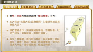 劉銘傳曾參與討平太平天國,與洋人有所接觸,觀念新穎;其所推動的措施對臺灣現代化有具體的影響。其中有五大重要措施分別為:開山撫番、整頓財政、交通建設、振興商業城市、政治中心北移。