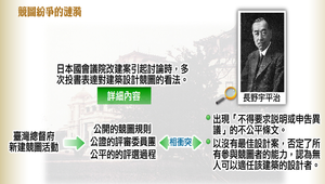 長野宇平治對總督府競圖案一直無法釋懷。在日本國會議院改建案引起討論時,多次投書表達對建築設計競圖的看法。臺灣總督府新建競圖活動,原是冀望在公開的競圖規則、公證的評審委員團、公平的的評選過程中,透過民主自由競爭的制度,選出最佳的設計者。最後呈現出的規程,第十五條「不得要求說明或申告異議」之類的不公平條文,造成評審過程與結果的爭議。同時,評審結果以沒有最佳設計案,否定了所有參與競圖者的能力,認為無人可以適任該建築的設計者,是最具爭議的地方。