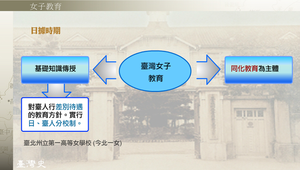 日治時期臺灣的女子教育為呼應殖民統治政策,亦以同化教育為主體,採漸進方式,對臺灣女子施行差別待遇的教育方針,也嚴格實行日、台人分校制。女子教育強調涵養婦德,培養嫻良溫淑的賢妻良母,並陶鑄忠貞不二的皇國女子;以初等、中等及初級職業教育為主,著重於精通日語、女子一般性的技能。雖然女子教育隨殖民政策的推展而普及全島,但臺女的教育,不論在數量上、教學內容、升學狀況及教師的素質等方面,皆受到不平等的差別待遇,落後日女甚多。