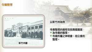 「皇民化」運動的內涵莫衷一是,而其中攸關傳統信仰的在地寺廟則是最早被革新的對象 ,課程以新竹州的寺廟整理為例,其寺廟整理的過程包括兩個層面,一為寺廟的整理,另一則是寺廟所屬之神明會、祖公會的整理。並將寺廟的整理分為四步驟。