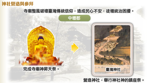 因為「皇民化」運動的寺廟整風破壞了臺灣傳統信仰,。因此,在完成寺廟神的昇天祭後,接著就是營造神社,並舉行神社神的鎮座祭。在地方官員大力宣導之下,參拜神社逐漸成為國民精神運動之ㄧ。各級機關團體從不定期到定期,神社參拜成了戶外活動的重要形式之一,且神前結婚也蔚為風潮。