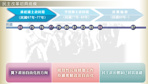 民國67年至77年蔣經國主政時期,奠下政治自由化的方向。民國77年~89年李登輝主政時期,持續推動政治自由化。民國89年以後,政黨輪替、政權和平轉移的民主政治體制,已初具基礎。