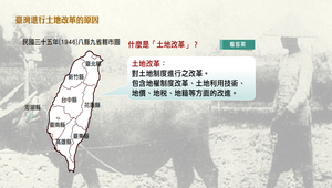 土地改革就是對土地制度進行的改革,包括為了除去原土地所有制度的弊害所進行的地權制度改革,以及各種有關土地利用技術、地價、地稅、地籍等方面的改進。想要了解臺灣進行土地改革的原因,必須從土地改革前夕的臺灣社會,還有戰後臺灣土地的問題這兩個方面來看起。