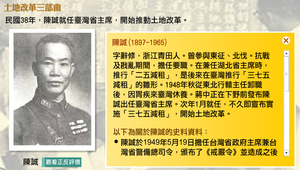 民國38年陳誠就任臺灣省主席,開始推動土地改革。擔任臺灣省政府主席兼台灣省警備總司令期間,頒布了《戒嚴令》並造成之後的白色恐怖的開始,對臺灣社會的民主化進程造成巨大負面影響。 1月5日他一上任就發表「人民至上,民生第一」的政見,以穩定當時浮動的民心。之後隨即確定「以農業培植工業,以工業發展農業」的政策。