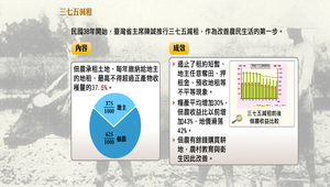 民國38年開始,臺灣省主席陳誠推行三七五減租,作為改看農民生活的第一步。內容為佃農承租土地,每年繳納給地主的地租,最高不得超過正產物收穫量的37.5%。其成效是遏止了租約短暫、地主任意奪田、押租金、預收地租等不平等現象。糧產平均增加30%,佃農收益比以前增加43%,地價滑落42%。佃農有餘錢購買耕地,農村教育與衛生因此改善。