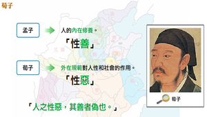 荀子處身戰國晚期,其思路的起點是「性惡」。荀子以為「人之性惡,其善者偽也。」。人性具有若干惡性,若放縱生而好利的性或好聲色的性,則必然產生爭奪、淫亂之事,而歸於暴。為了不讓這種惡性放縱,荀子更強調外在功夫在克服人性弱點上的作用;依靠後天的教育,使人養成遵守規則和服從秩序,成為彬彬君子。荀子主張「定分」使貴賤長幼貧富皆有等差,確定每人的權利義務;一經確定,各安其分。所以,禮可以「定分止爭」,這就是荀子「隆禮」的說法。
