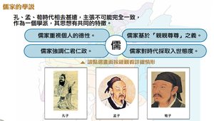 儒家重視個人的德性,基於「親親尊尊」之義,擁護一套等差階級的社會關係。且儒家強調仁君仁政,治國應以德教為本。而儒家對於時代基本上是採取入世的態度,讀書修身的目的在於經世致用,自內聖而外王。個人修德是治國平天下的前提和基礎,治國平天下是個人修德的自然延伸和必然結果。