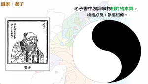 老子據說是楚人,著《道德經》五千字;書中強調事物相對的本質,以為物極必反,禍福相倚。書中除了談論人生處世之道外,亦有許多篇幅討論人君治國之術。老子以為理想的國度就是回到遠古之世的「小國寡民」;且統治者就是讓人民心中沒有知識,「民多智慧,而邪事滋起」。