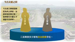 今古文之間雖壁壘分明,但仍有相似之處。首先,二派受兩漢讖緯之學的影響,我們現在看起來皆有荒誕不經之處。其次,二派興衰多少都有政治因素存在。其中今文經之興皆因朝廷為其立學官,治經成為利祿之途,自然吸引大量士子誦習今文經學。古文經之興起則是因劉歆借王莽的勢力刻意提倡,及至東漢古文經大盛,背後自然也跟君主獎勵有關。