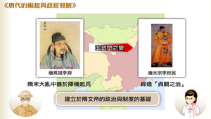 在隋文帝的政經的基礎之上,唐太宗李世民承襲隋朝的興盛,政治上發展三省六部制,另外於選才、土地、賦稅、軍事制度上均有重要改革。在民族融合方面,胡風更盛,華夷觀念淡薄。自隋朝開鑿的一系列運河,到了唐代對於南北經濟、文化交流、維護全國統一及中央集權制,都起了促進作用。