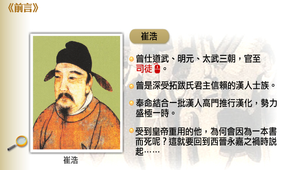 崔浩,曾於三朝任官,深受拓跋氏君主信賴的漢人士族,奉命結合一批漢人高門推行漢化政策,勢力盛極一時,然而,如此受到皇帝重用的他,為何會因為一本書而置之死地呢?這個原因就要從西晉的永嘉之禍說起。