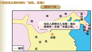 西元311年,匈奴人劉聰攻入洛陽,擄走晉懷帝,史稱為「永嘉之禍」。五年之後,劉曜攻破長安,西晉愍帝投降,象徵統一大帝國時代的結束,中國歷史進入新局─東晉南北朝。
