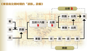 與江南東晉政權相對應的是遼東、華北、蜀地、江淮一帶的「五胡十六國」,「五胡十六國」時間長達百餘年,政權數目事實上不止十六,族群也不限「五胡」。西元439年北魏拓跋氏統一北方,開啟了「北朝」。