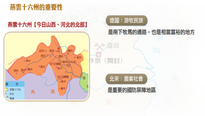 燕雲十六州在今天山西、河北的北部,包括長城以南一線的領土,連同今日的北京在內,此區域正是農業社會與游牧民族的交接地區, 對於中原農業社會來說,是重要的國防屏障地區,對游牧民族來說,則是南下牧馬的通路,同時也是一塊相當富裕的地方。