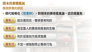 明代陸楫在〈禁奢辨〉一書中,對於明末的奢侈風氣,提到四個重點論點:就社會而言,奢侈是有利的、肯定富人的奢侈便是貧者的生機、利於促進地方經濟發展,以及不宜一律強制禁止奢侈行為。