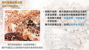 明朝中後期,集市廟會的定期商品交換形式更加頻繁,從首都到州縣鄉鎮都有舉行。各地集市廟會「百貨俱陳,四遠競湊」,非常熱鬧。集市的普遍出現,說明以自然經濟為主、商品經濟為輔的傳統經濟模式進入成熟階段。由於集市所處的地理位置及週邊環境的差異,集市有大有小,有些逐漸發展為人口較多的市鎮,吸引了大批外地商人。