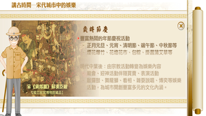 由歲時節慶、說唱戲曲、話本小說三方面,採圖文展示介紹宋代城市庶民的娛樂生活。