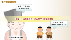因為士紳菁英地位的關係,因此在社會上總是享有著許多的特權。第一、不但本身免役,就連家戶裡的兄弟,依法律規定也可免除差役。第二、明代法律禁止庶民之家使喚奴婢,士大夫階層有權利使用奴婢。第三,舉人、貢生犯了死罪,可以特赦三次。第四、士大夫如無力完納賦稅,可以由地方官奏請豁免。