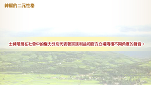 士紳階層是國家和地方政治銜接的橋樑。作為地方宗族的領袖,他們與政府結成聯盟,在本地承擔許多職責,他們擔任官員與當地百姓之間的仲介,就地方事務出謀劃策。同時在官吏面前又代表了地方利益。在一般情況下,政府和士紳的主要利益是一致的,在維持社會秩序的穩定發展上,他們相互合作。但是當他們的利益相悖時,士紳則會批評,甚至反對和抵制官府的行政,不過通常不會對中央政權造成嚴重威脅。
