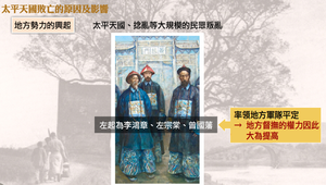 太平天國、捻亂等大規模的民眾叛亂,靠著曾國藩、左宗棠、李鴻章等人率領的地方軍隊才得以平定,地方督撫的權力因此大為提高,這種地方勢力的興起,是十九世紀中葉以後約一個世紀中,中國歷史上明顯的特色。