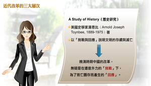 清末民初在外力的挑戰下,中國學習西方的文明有三個層次,包括器物、制度與思想三大層次。器物層次如北洋海軍的成立,制度層次包括戊戌變法、庚子後新政與立憲運動等,思想層次如民國初年的新文化運動。