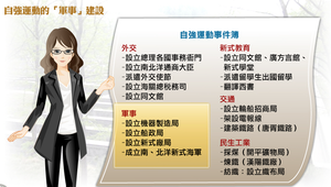 自強運動在軍事方面的建設,包括設立機器製造局、設立船政局、設立新式廠局與成立南、北洋新式海軍等。