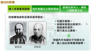 戊戌變法的影響分別有:「國人逐漸重視國事 」、「海外有識之士鼓吹革命 」以及「慈禧仇恨洋人,導致八國聯軍之役 」三項。政變爆發維新派康梁僥倖脫逃,在國外辦報、組織保皇會出版報刊,倡議實行君主立憲制,國人自此逐漸重視國事。當時出國留學或受國內新式教育的知識份子日多,他們對於清廷的無能感到失望,於是紛紛撰文支持革命,加入革命行列。 政變後,慈禧保守派雖然掌握大權,但是當時各國駐華使節紛紛表示「還政光緒帝」,致使慈禧更加不滿洋人而仇恨洋人,其後因為袒護「義和團」意欲消滅洋人,釀成八國聯軍之役。