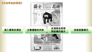 辛亥革命的背景可以從四個面向來看,分別是:「病入膏肓的清廷」、「立憲運動的失敗 」、「反清革命思想與組織的強大 」以及「武裝起義頻仍 」。
